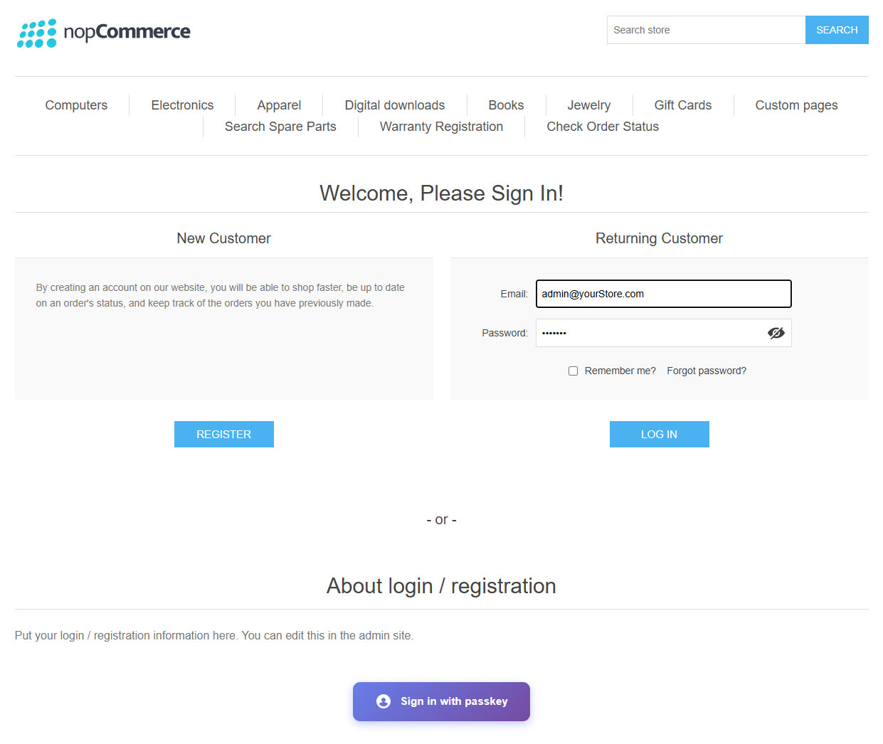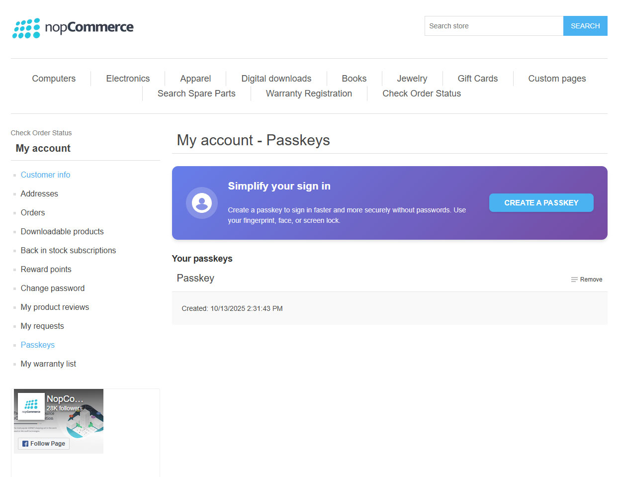 Installation and configuring plugin Passkeys Install the plugin and enable it. That's all. When the customer creates the account he will see a new menu item "Passkeys". He could see the linked passkey and create a new one. The customer will see the paskey button on the login form.